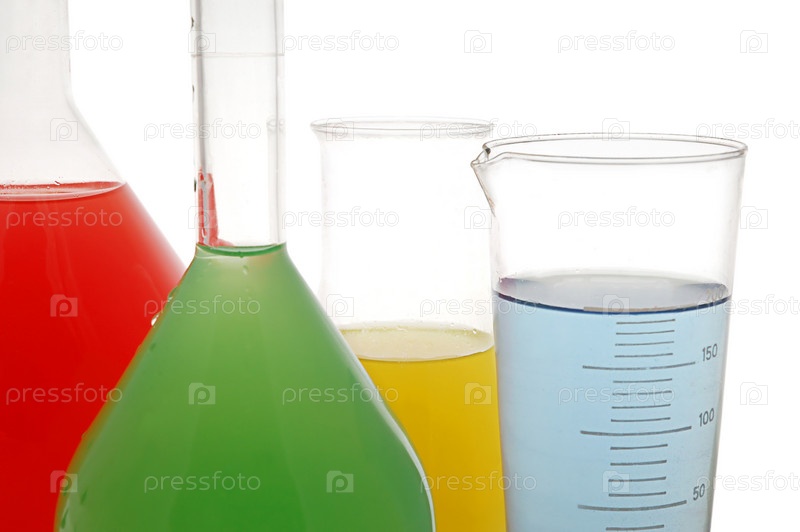 Лабораторные колбы с химическим веществом на белом фоне