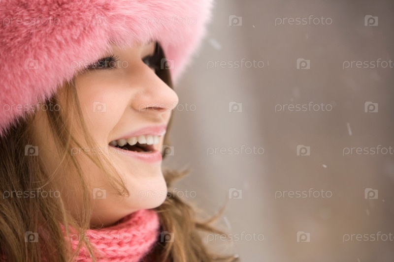 Близкий план счастливой женщины в модной меховой шапке, смеющейся во время снегопада