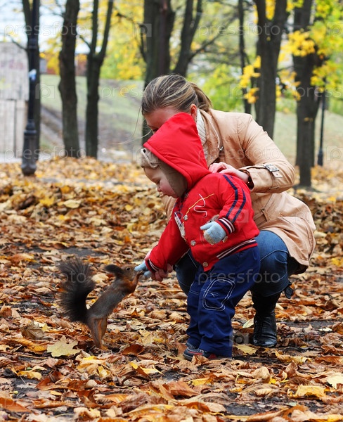 Мама с сыном кормят белку в парке