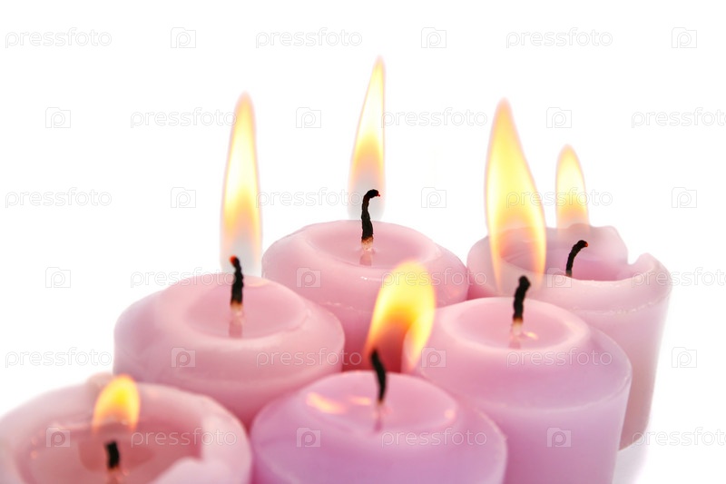 Розовые горящие свечи на белом фоне