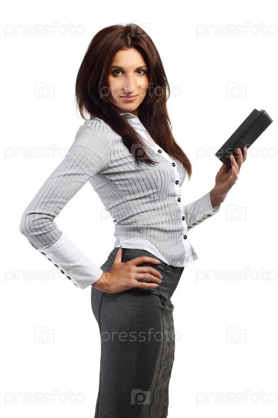 Молодая женщина с электронной книгой, изолирована на белом фоне