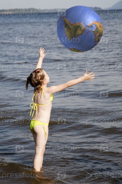 Девочка играет в мяч у реки