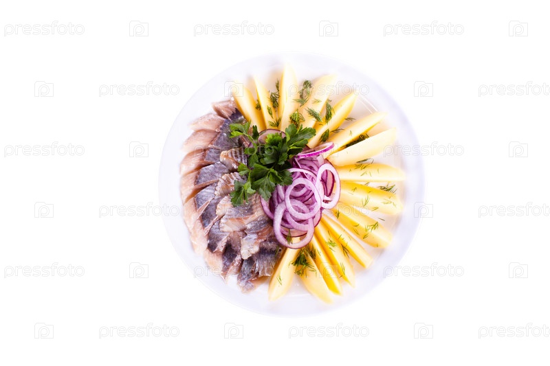Кусочки сельди с картофелем и луком на тарелке