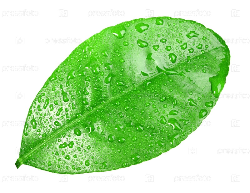 Зеленый лист с каплями воды. изолировано на белом фоне. крупным планом