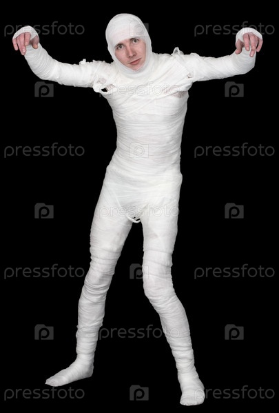 Человек-мумия в бинтах на черном фоне