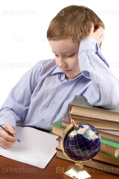Мальчик делает домашнее задание на белом фоне
