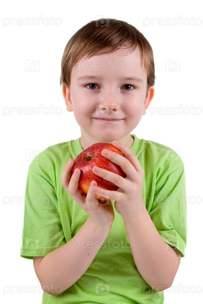 Мальчик с яблоком на белом фоне