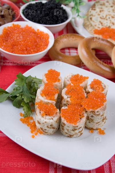 Блинчики с красной и черной икрой