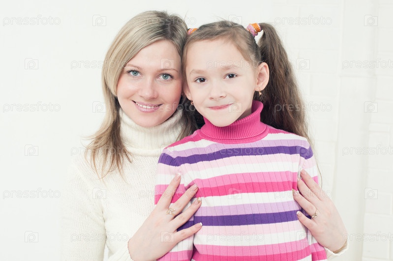 Молодая улыбающаяся женщина обнимает свою 7-летнюю дочь