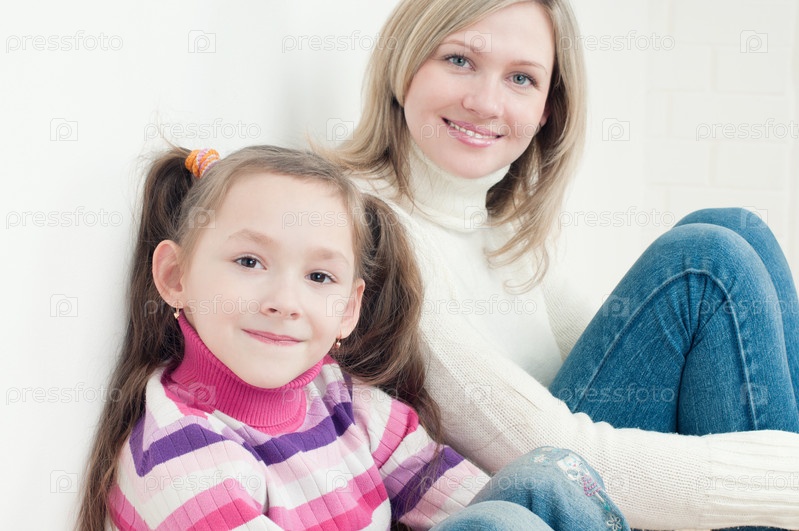 Маленькая девочка сидит с мамой на полу и смотрит в камеру