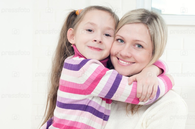 Маленькая девочка обнимает за шею свою маму