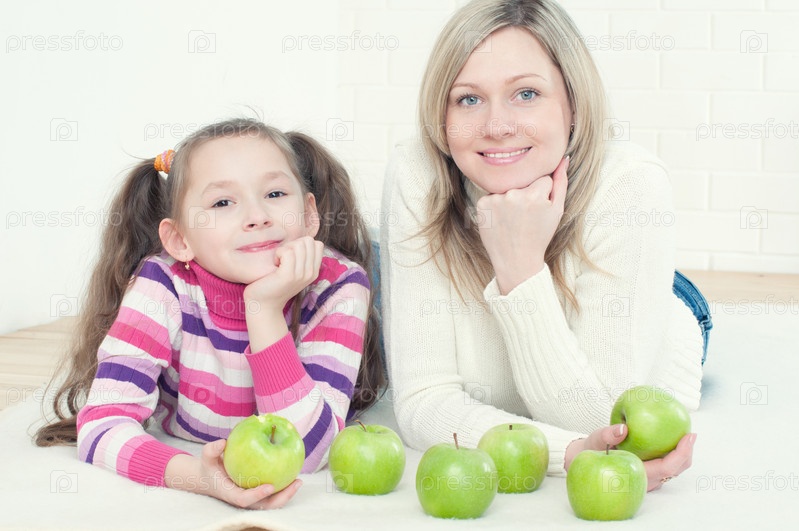 Улыбающаяся молодая мама и ее дочка лежат на полу с зелеными яблоками