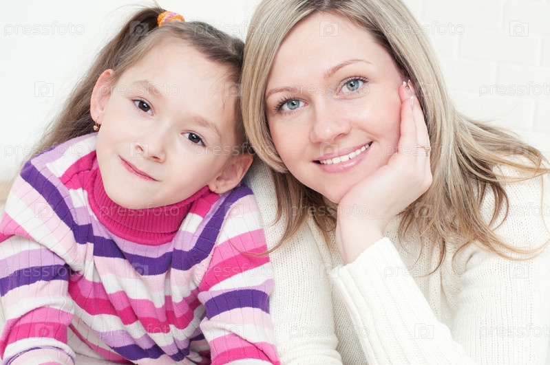 Улыбающиеся мама и дочь лежат на полу и смотрят в камеру