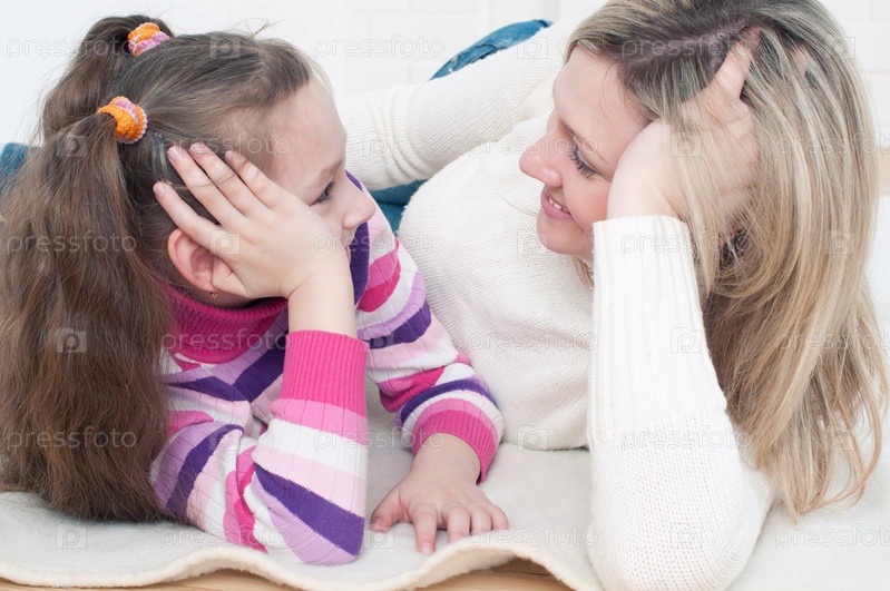 Счастливая мама с дочкой лежат на полу и смотрят друг на друга