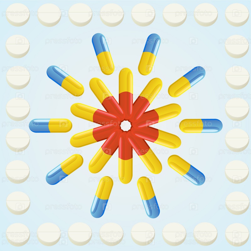 Капсулы и таблетки на голубом фоне