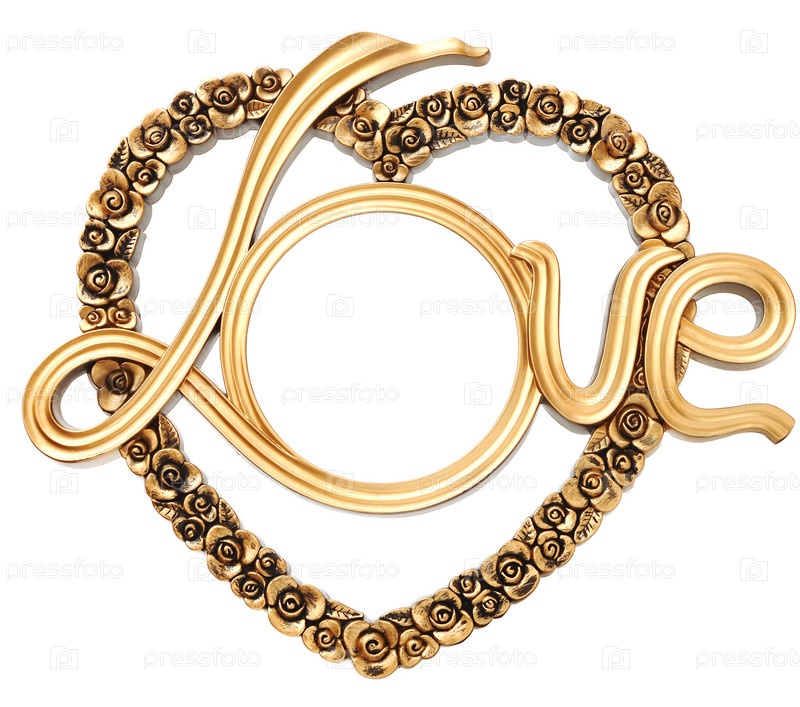 Слово LOVE в золотой раме в форме сердца, изолированное на белом фоне