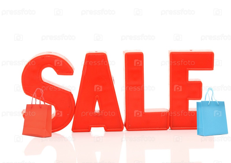 Слово распродажа и бумажный пакет на белом фоне