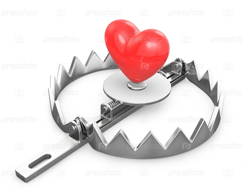 Красное сердце в капкане на белом фоне