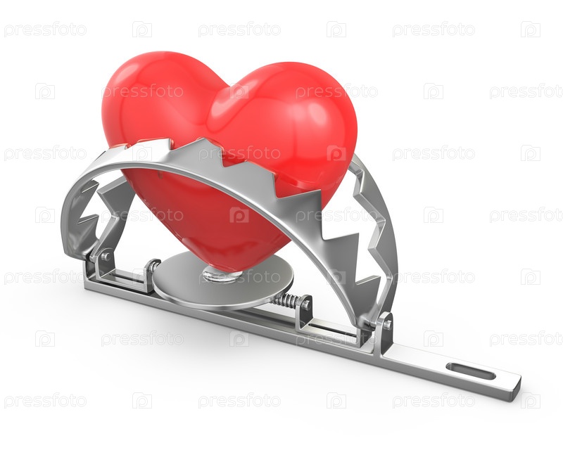 Красное сердце в капкане на белом фоне
