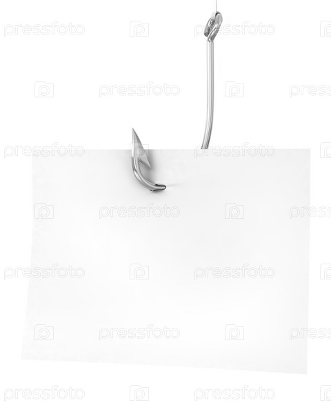 Чистый лист бумаги на рыболовном крючке на белом фоне