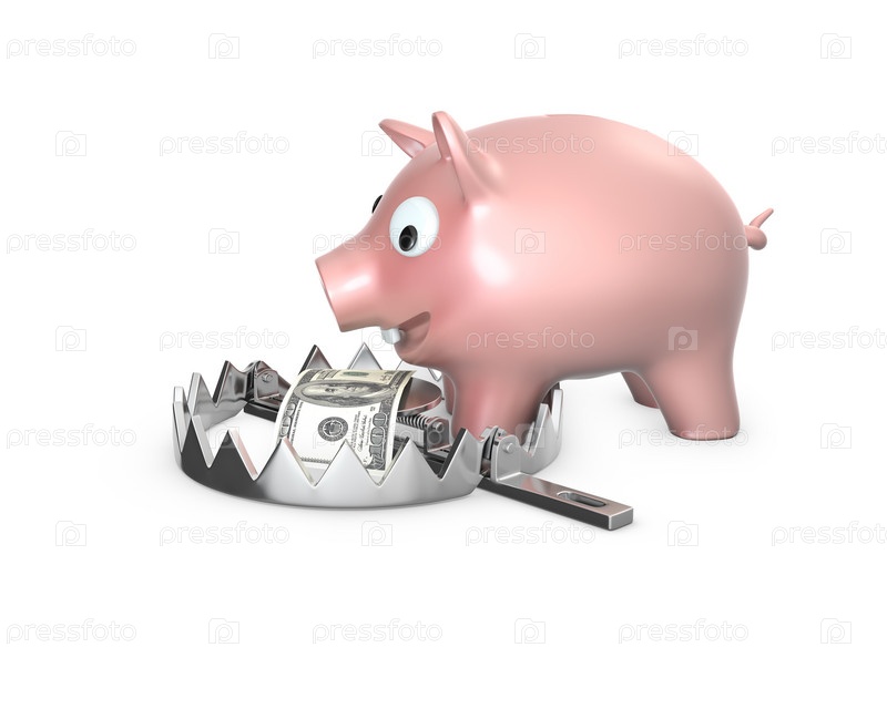 Копилка с долларом в капкане на белом фоне