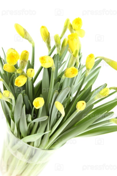 Букет из желтых нарциссов в вазе. изолированно на белом фоне