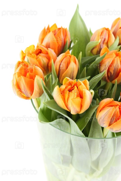 Букет оранжевых тюльпанов в вазе, крупным планом, изолировано на белом фоне