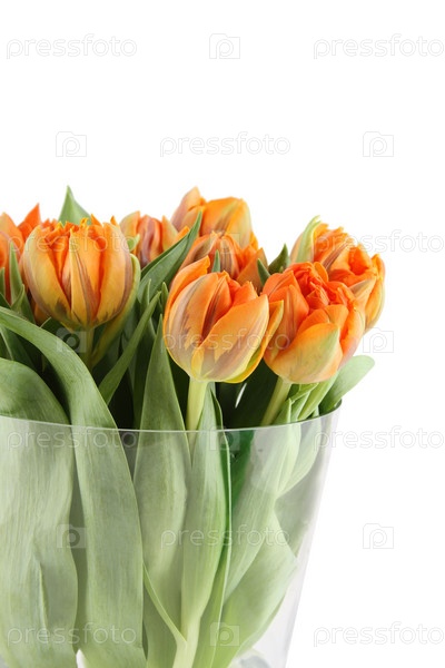 Букет оранжевых тюльпанов в вазе, крупным планом, изолировано на белом фоне