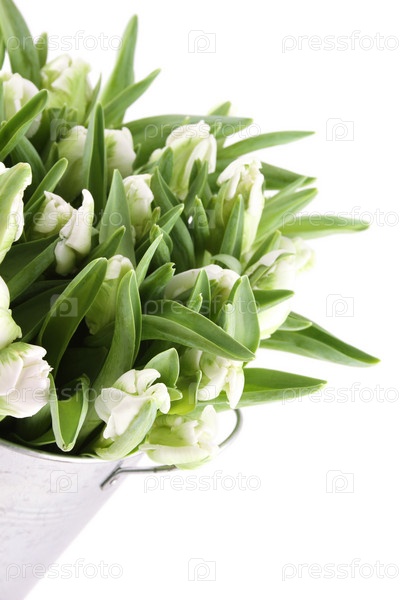 Букет из белых тюльпанов в ведре. изолировано на белом фоне