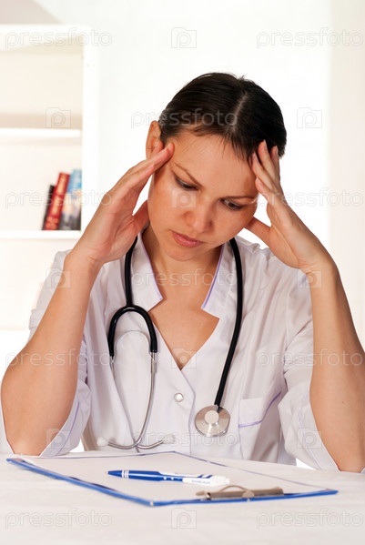 Задумчивая женщина-врач в кабинете
