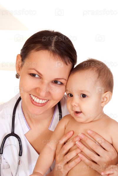 Женщина-врач с новорожденным на белом фоне
