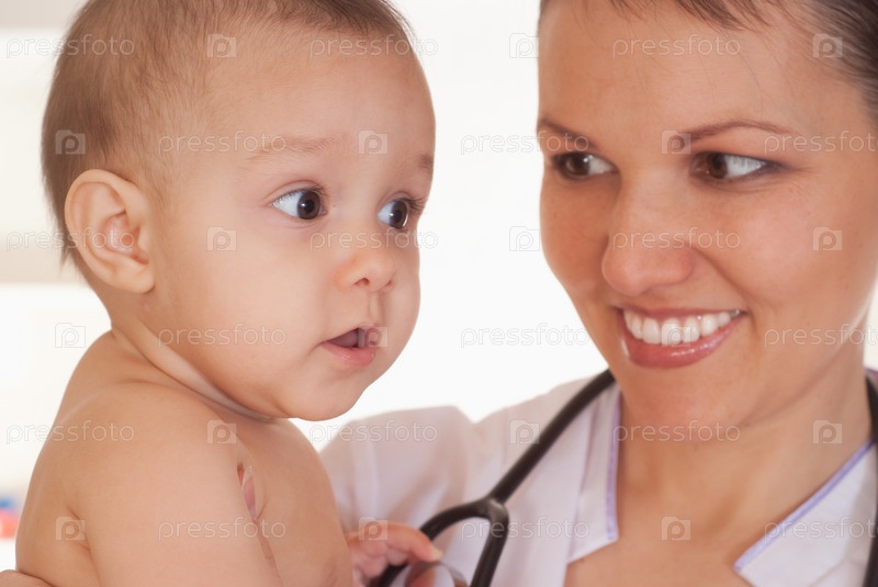 Женщина-врач с младенцем на белом фоне