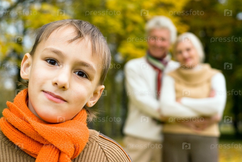 Мальчик и пожилая пара в осеннем парке