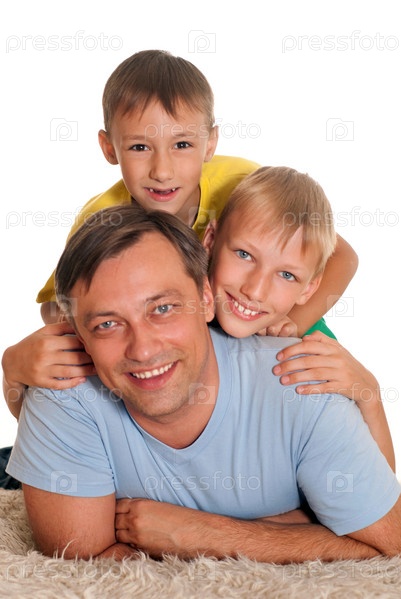 Счастливый отец с двумя сыновьями на белом фоне