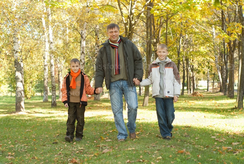 Счастливый отец с двумя сыновьями в осеннем парке