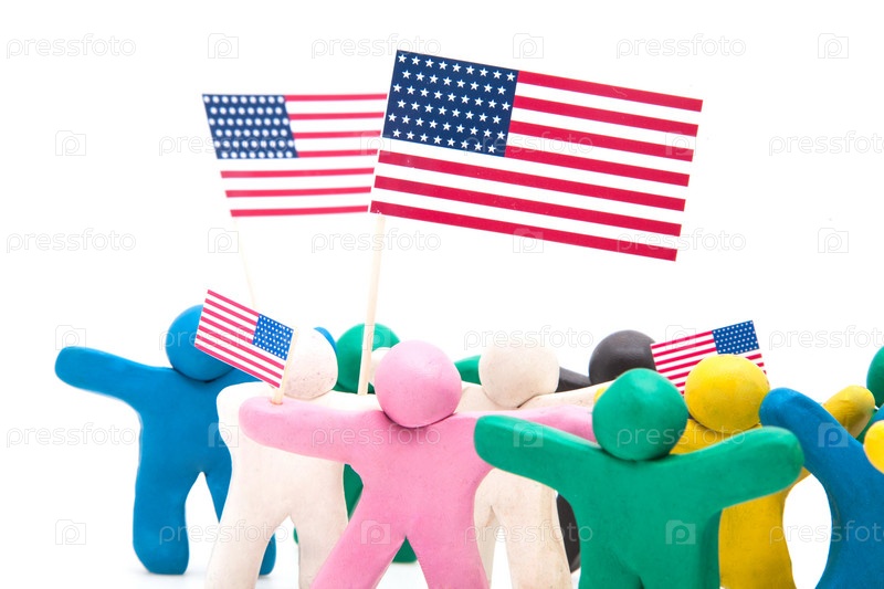 Группа красочных пластилиновых людей с флагами США