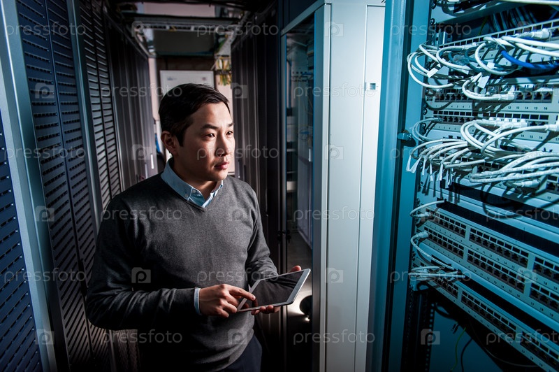Молодой инженер в серверной комнате