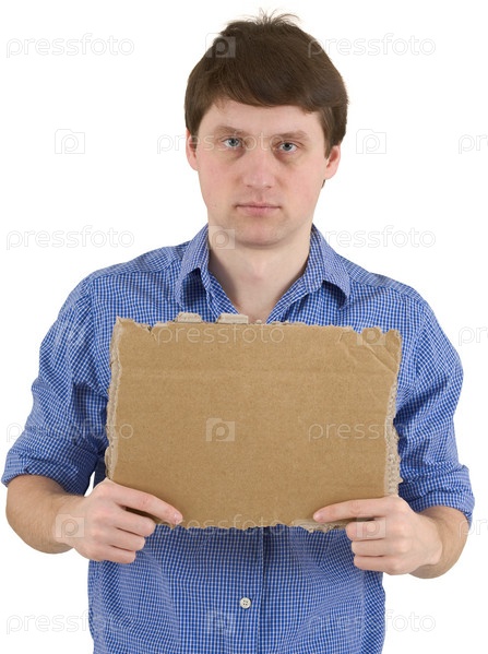 Человек и картонная таблетка на белом фоне