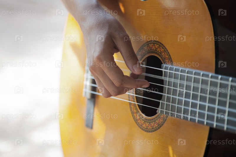 Женская рука играет на акустической гитаре