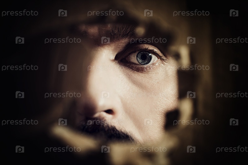 Мужчина смотрит через отверстие в стене