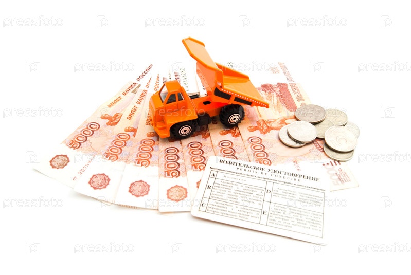 Грузовик, водительское удостоверение, монеты и банкноты