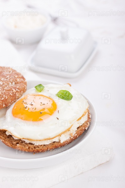 Булочка с яйцом, творогом и свежим базиликом