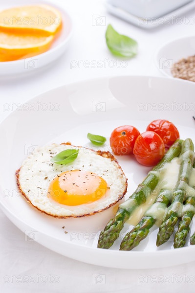 Яичница с спаржей и помидорами