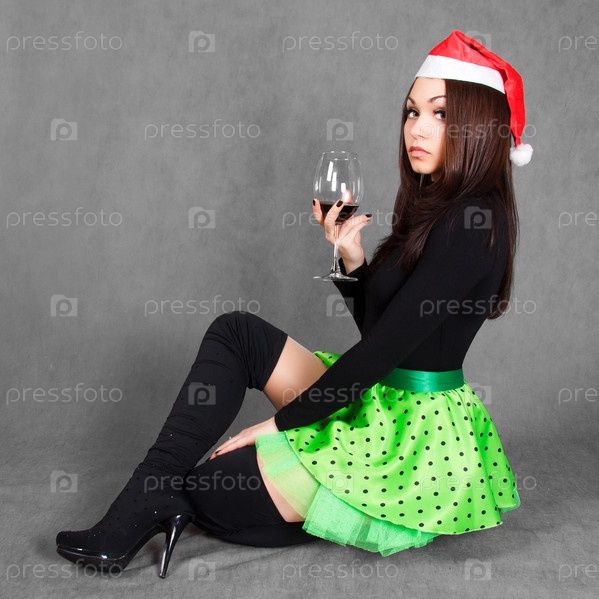 Красивая девушка в рождественской шапке с бокалом вина