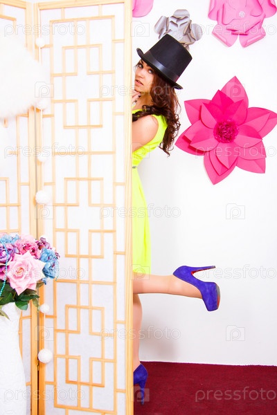 Счастливая молодая женщина в цилиндре