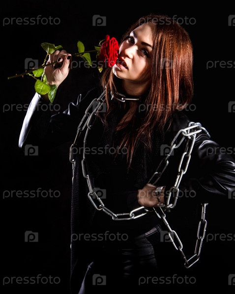 Красивая молодая женщина с цепью и красной розой