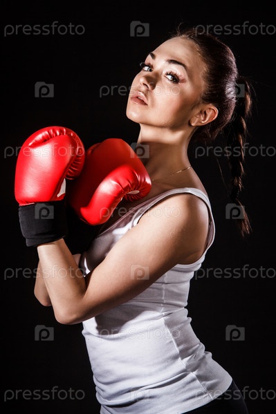 Красивая молодая женщина в красных боксерских перчатках
