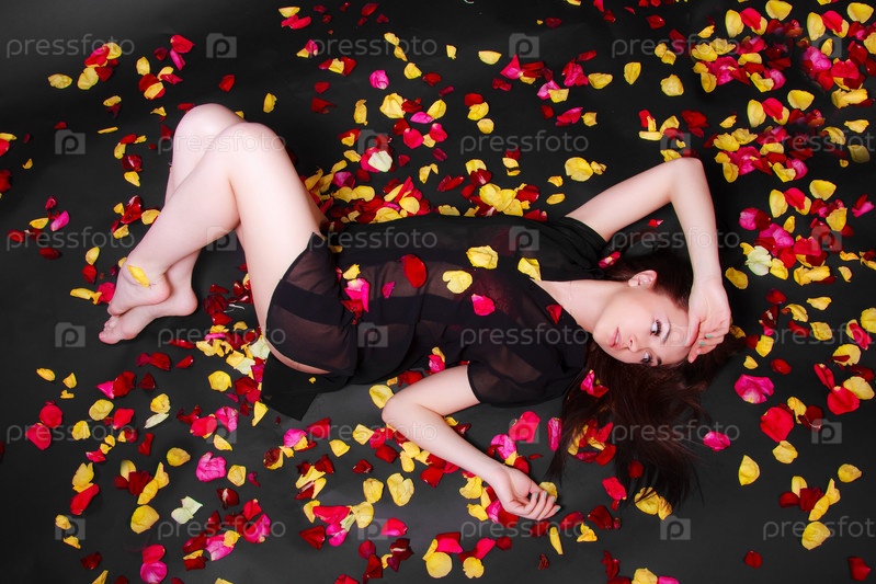 Красивая молодая женщина среди лепестков роз