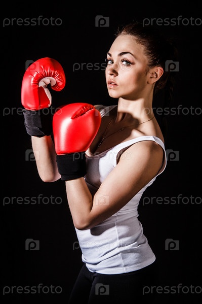 Красивая молодая женщина в красных боксерских перчатках