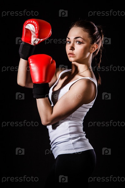 Красивая молодая женщина в красных боксерских перчатках